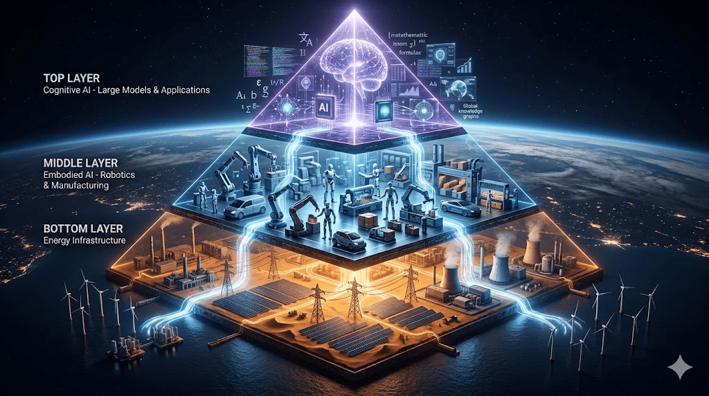 • 人工智能的发展呈现出一个三层金字塔结构。最上层是改变人类认知与思维活动的大模型与应用;中层是改变人类体力劳动与生产方式的机器人与制造业智能化;最底层则是支撑整个AI时代的能源基础设施。下一代人工智能的能源消耗将极为庞大,没有充足且可持续的能源供应,上层与中层的发展将难以落地。